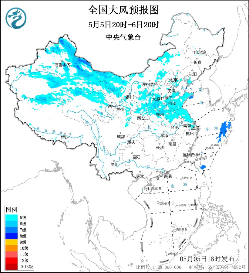 预计,5月5日20时至6日20时,新疆北部和南疆盆地东部、内蒙古中西部、青海北部和东部、甘肃河西、宁夏、陕西北部、山西、河北东部和南部、河南中北部、山东大部、苏皖北部等地有5~6级风,阵风8~10级;渤海海峡、山东半岛东部沿岸海域、东海东部海域将有7级、阵风8级的大风。